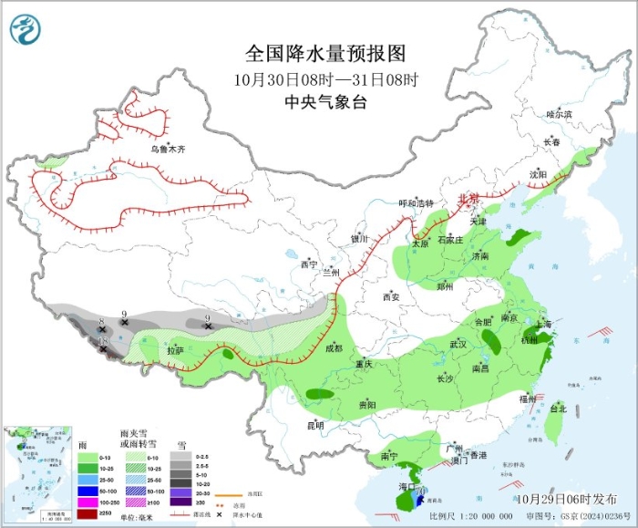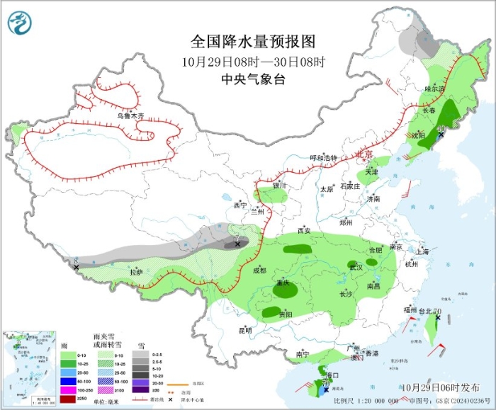 10月29日08时至30日08时,内蒙古东北部、黑龙江北部、新疆南疆西部山区、西藏东北部和南部、青海南部、川西高原等地部分地区有小到中雪或雨夹雪,其中,西藏南部、川西高原北部等地局地有大雪(5~8毫米)。吉林东部、辽宁东部、陕西南部、湖北东部、四川盆地东部、重庆西部、贵州西部和东北部、广东西南部沿海、海南岛、台湾岛东部等地部分地区有中到大雨,其中,海南岛东南部、台湾岛东部等地局地有暴雨(50~70毫米)。内蒙古东北部、辽宁中南部、山东半岛等地部分地区有4~6级风;渤海、渤海海峡、东海北部海域、北部湾将有5~6级、阵风7级的大风,东海南部海域、琼州海峡、南海北部海域、台湾海峡、台湾以东洋面、巴士海峡将有5~7级、阵风8~9级的大风。
